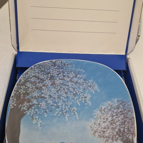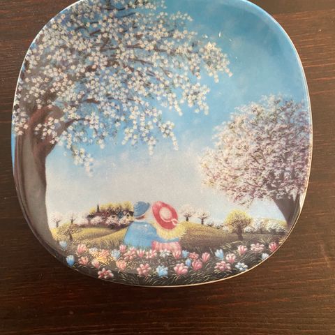 Arabia Kevättunnelmia koriste-esine posliinista halkaisija 13cvm, Pyöristetyn neliön muotoinen lautanen, jossa värikäs keväinen maisemakuva puista, kukista ja hahmoista. Takana teksti Kevättunnelmia / Vår / Spring atmosphere / Frühlingsstimmung sekä suunnittelijan nimi Anita Rantanen-Siewers ja Arabia Finland -leima. Soveltuu keräilyyn tai sisustuskäyttöön.