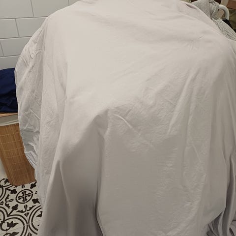 Annetaan pois kuvien mukainen tumman sininen (toisesta kuvasta näkyy paremmin oikea väri) lakana. Muotoonommeltu. Kerää hieman nukkaa/hiuksia. Haku Kupittaalta.