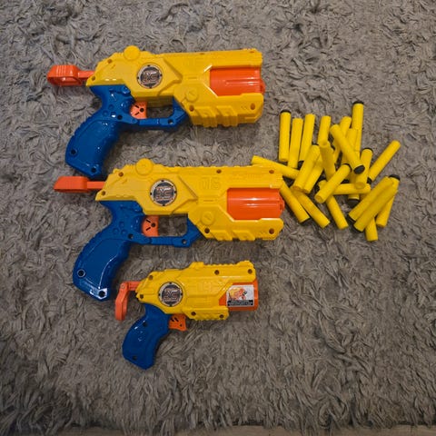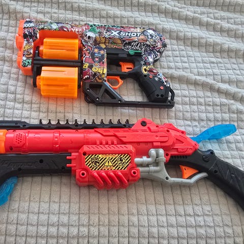Erittäin hyvät ja varmastikin lähes uudenveroiset X-shot aseet. Hyvin vähän käytetty. Panoksia laitan sen verran mukaan, kuin aseisiin mahtuu, mm tuohon "telineeseen" aseiden yläosassa.