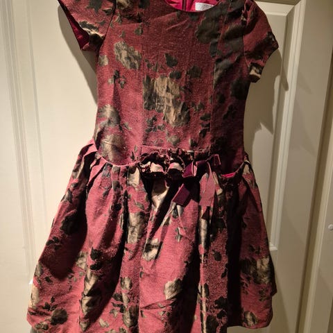 - Kerman vaalea mekko, jossa sifonkimainen päällyskangas ja alla vuori. Kauniit pitsikoristelut vyötäröllä ja yläosassa. Säädettävät olkanauhat menevät ristiin selässä. Takana vetoketju. Vila.