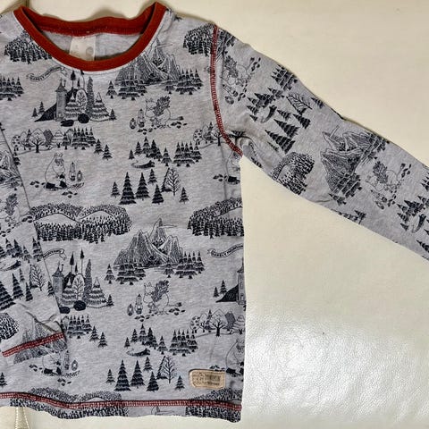 Muumi pitkähihainen paita lapsille, koko 110. Ruskean- vihertävä puuvillainen 97% ja 3% elastaania , paita, jossa Muumi-aiheinen kuosi ja vaalea rintatasku. Unisex-malli, jossa pyöreä pääntie ja nappikiinnitys edessä. Sopii arkipaidaksi eri vuodenaikoina.Hyväkuntoinen
