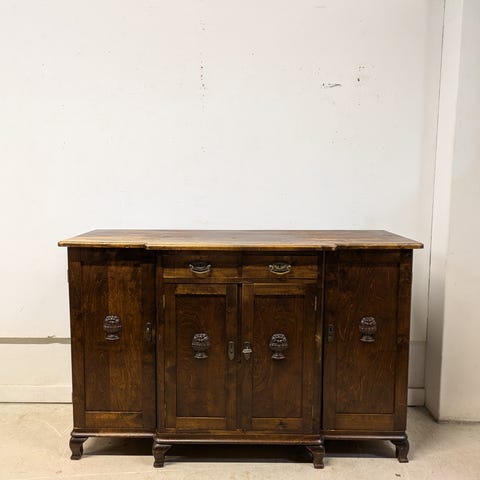 Puinen senkki, jossa yläosassa kapea hylly ja taustalevy peiliosalla. Senkissä on useita vetolaatikoita ja alakaapit ovilla, joissa metalliset vetimet ja lukot. Pinta on lakattua puuta lämpimän ruskeassa sävyssä. Sopii esimerkiksi olohuoneen tai ruokailutilan säilytyskalusteeksi ja laskutasoksi.