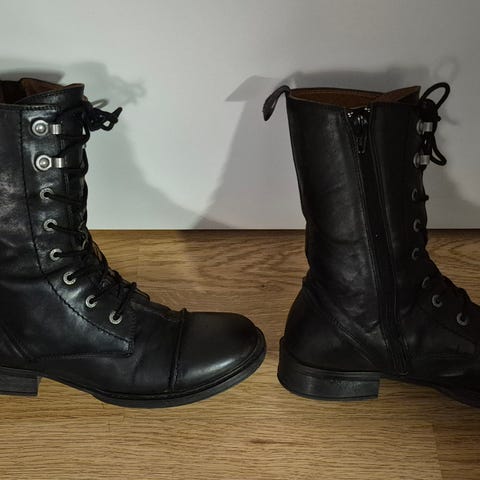Pitkällä varrella nahkasaappaat. Hyväkuntoiset, muuta moitittavaa ei ole kuin pieni naarmu toisen kengän kärjessä ja toisen kengän takana kolhu, kun osui terävää. Vähän käytetyt kengät.