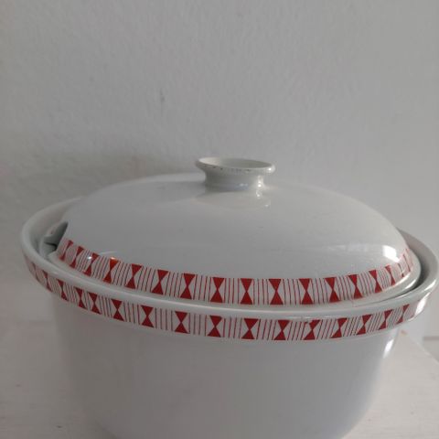 Arabia Seita soppakulho, jossa on kansi ja punainen kuviointi reunoilla. Kunto on hyvä, mutta sisäpuolella on pieniä käytön jälkiä. Design Raija Uosikkinen.