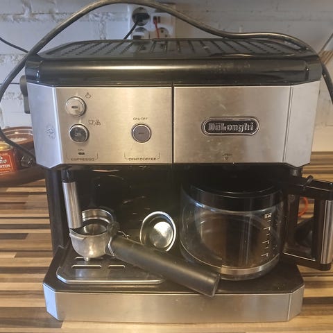 De’Longhi EC151.Bespressokeitin musta. Laite on manuaalinen espressokeitin, jossa on höyrysuutin maidon vaahdotukseen esimerkiksi cappuccinoa ja lattejuomia varten. Mukana tulee portafilter-kahva sekä mittalusikka/tamper. Vesisäiliö on irrotettava täyttöä ja puhdistusta varten. Sopii jauhetulle kahville. Vähän käytetty.