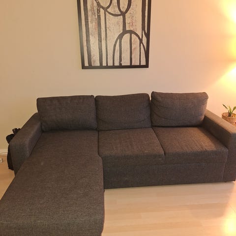 Käytön jälkeä pintakankaassa, jälkiä ei ole kokeiltu pestä tekstiilipesurilla. Myös vuodeosassa jälkeä. Sohvan takaosassa valkoista maalia pienet läntit (näkyy kuvassa), itsellä sohva seinää vasten niin ei ole näkynyt. Kankaassa ei repeämiä tms. Ei ole siis uudenveroinen mutta mielestäni oikein käyttökelpoinen sohva vielä eteenpäin.