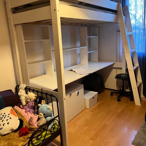 Vekestä pari vuotta sitten ostettu parvisänky lapselle. Pidennettävä pöytä sivussa. Sängyn ja pöydän päädyissä hyllyköt. Sängyn alla avointa tilaa leikeille tai säilytykselle. Pöydässä ja laidassa pari pientä kulumaa (kuvat), muuten erittäin hyvä kuntoinen, kuin uusi. Patjakoko 80x200cm. Muita mittoja yv:llä. Vain nouto Tupoksesta.