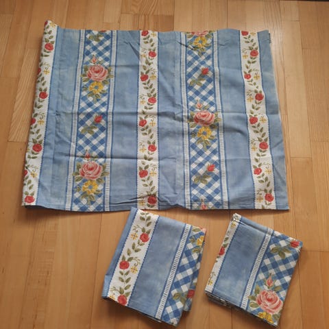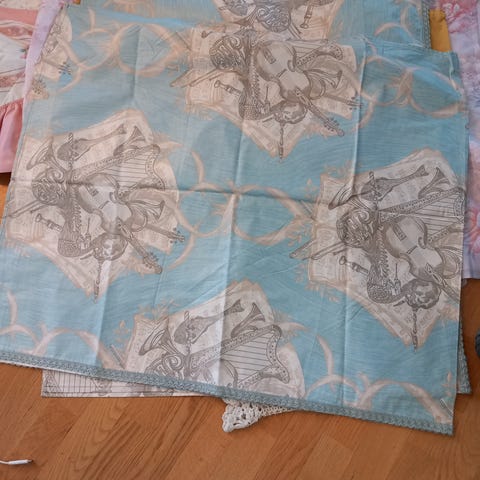 2 kpl valmiiksi ommeltuja verhokappoja pituudet 265 cm ja 243 cm, 2 kpl kappakankaita, pituudet 280 cm ja 257 cm, kapan korkeus on 56 cm. Yht. 10 euroa.