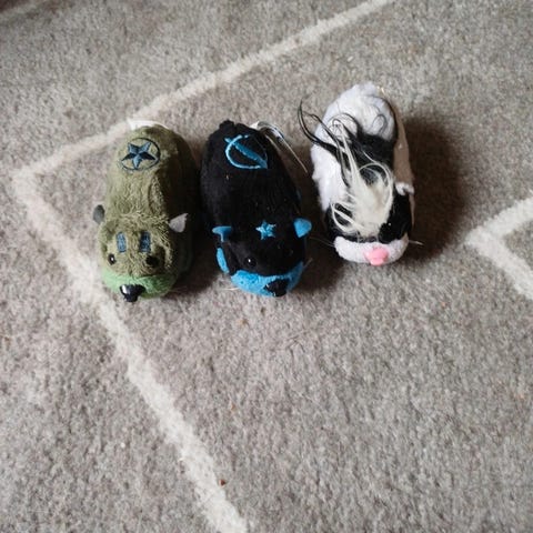 Neljä kappaletta Zhu-Zhu Pets hamstereita. Ovat vanhoja ja leikittyjä, toiminnasta ei takuuta. Saattavat hyvin toimiakin, ei ole testattu. Sopivat leikkiin tai keräilijän hyllyyn. Mukana tulee myös ”paita”, jonka hamsterille voi pukea päälle.
