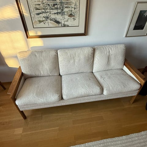 Hyväkuntoinen kolmen istuttava beige sohva. Päälliset juuri pesty. Sohva on Joensuun keskustassa.