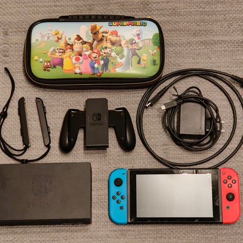 Täysin toimiva hyväkuntoinen nintendo switch konsoli kolmella Joy-con ohjaimella ja muistikortilla. Käytön jälkeä vuosien varrelta on kertynyt, mutta ei mitään mikä haittaisi toimintaa. Konsolin näytössä on pidetty aina suojalasia, joten on erittäin siistissä kunnossa.