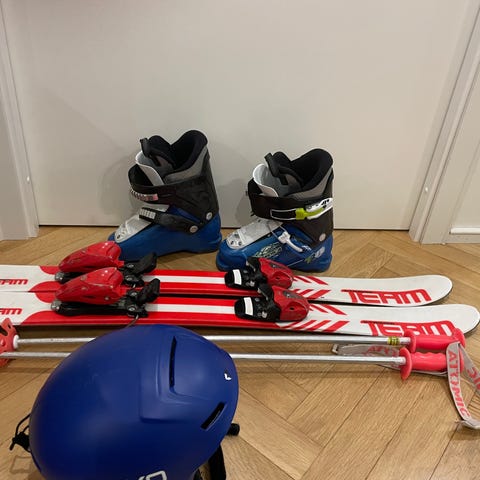 Head lasten laskettelusukset 87 cm ja monot koko 29. Suksissa siteet. Briko sinipunainen laskettelukypärä.