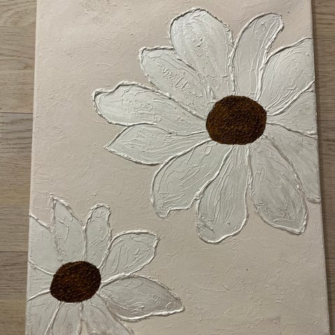 Itsetehty taulu akryyliväreillä ja tekstuurimassalla. Tausta helmiäiskeltainen/kultainen.