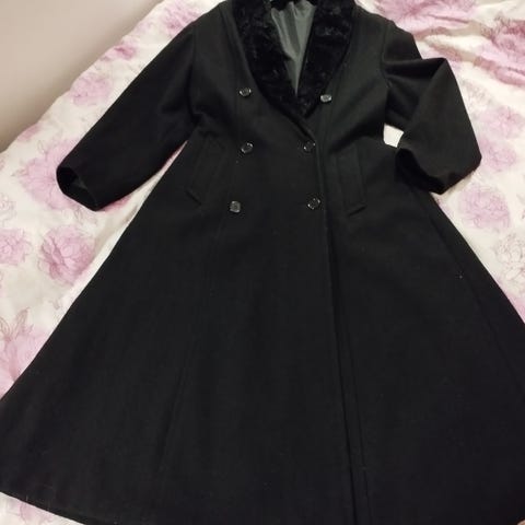 75% villaa, vuori 100% viskoosia. Koko 40/42 tai M/L. Pituus kauluksesta helmaan n. 120 cm. Takana upea leikkaus. Taskut edessä ja tampit hihoissa. Kauniit marmorimaiset napit.