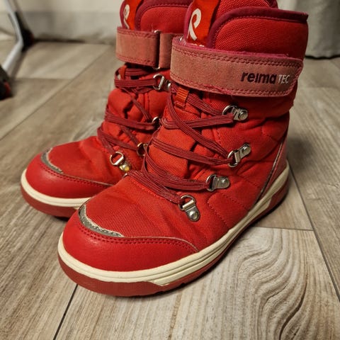 Viime talvena uutena ostetut, nyt pieneksi jääneet Reiman talvikengät. Yleiskunto on mielestäni hyvä, sisältä ovat ehjät ja muutenkin ihan siistin näköiset. Kärjissä vähän kulumaa ja pohjissa, kantapäiden kohdilla, siksi kuntoluokitus on kohtalainen.
