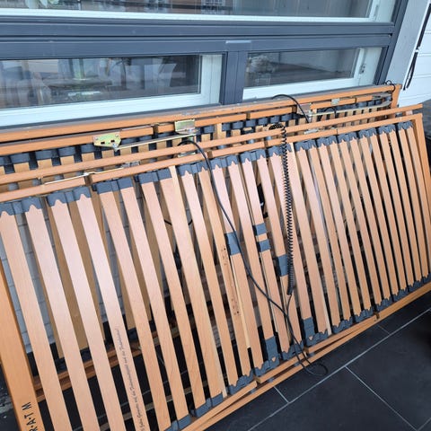 Joko Maskun tai Sotkan moottorisänky, jossa sähkökäyttöinen säätö pää- ja jalkopäähän. Sänky on verhoiltu harmaalla kankaalla ja siinä on vaalea päällinen. Mukana on johdollinen kaukosäädin.