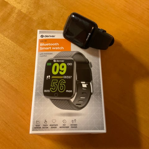 Denver Bluetooth smartwatch älykello mustalla rannekkeella. Kellossa on kosketusnäyttö ja useita kellotauluja. Toiminnoissa näkyvät muun muassa askel- ja aktiivisuusseuranta sekä perusilmoitukset. Ranneke on säädettävä ja kiinnitys tapahtuu perinteisellä soljella. Kello yhdistyy puhelimeen Bluetooth-yhteydellä. Pakkaus mukana kuvien mukaisesti. Laturi tulee myös mukana.
