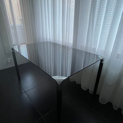 Hieno lasinen ruokapöytä. Jalat on metallia jotka saa irti helpottamaan kuljetusta. Pinnassa käytönjälkeä mutta yleisilmeeltään siisti. Siitä nopealle tukeva pöytä.