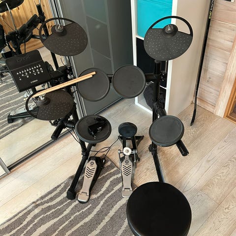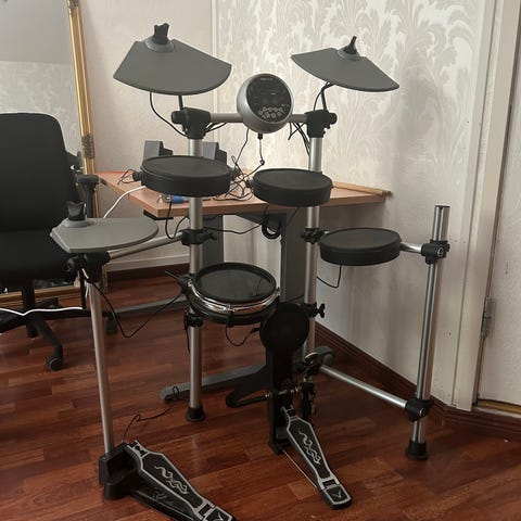 Mukaan kuuluu: Räkki, kaapelit, jakkara, viisi rumpupädiä, kolme symbaalipädiä, bassorumpupädi, bassorummun pedaali, hihat pedaali ja kuulokkeet. Kapulat saa kaupan päälle.