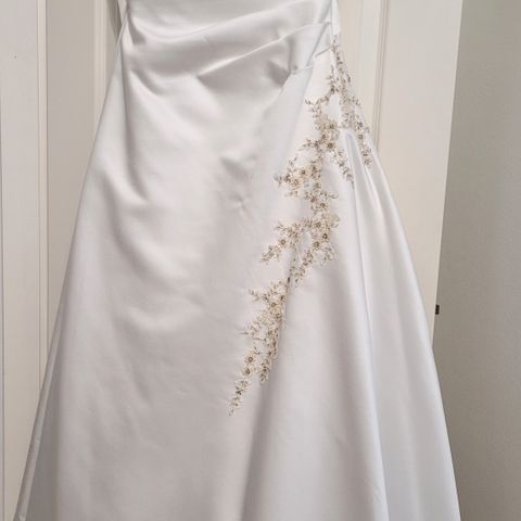Kahdella morsiamella ollut, siistikuntoinen ja pesulassa pesetetty hääpuku. Muhkea, mutta mukavan tuntuinen ja hyvin istuva mekko. Mekon yläosassa on tukevat kupit, joten liivejä ei tarvitse mekon kanssa käyttää. Helman sisäpuolella on rannelenkki ja ulkopuolelle on teetetty laahukselle nappikiinnitys, jotta mekko päällä on helpompi liikkua. Nappi tosin irtosi, mutta oletettavasti helppo ommella takaisin ken osaa.