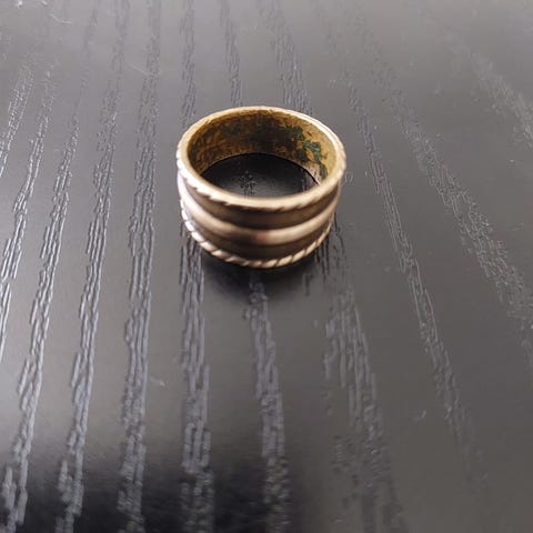 Kalevala sormus naisille. Materiaalina hopea. Tämän sormuksen esikuva on peräisin kansainvaellusajalta ja se on löydetty Karjaalta. Keskeltä levenevä, reunoilta kierrekoristeltu sormus viehättää yksinkertaisella kauneudellaan.
