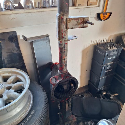 M Fordista perä. Todennäköisesti farmarista, kun tiuha välitys ja isot jarrukilvet. Isot jousien kiinnikkeet, mutta ei ylempien tukivarsien korvia. Kätevä kyllä tarvittaessa hitsaa sellaiset. En ole käyttänyt vetoakseleita irti, joten en osaa sanoa pyöränlaakereista mitään. Pyörii kuitenkin hyvin.