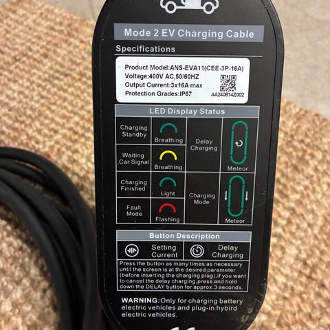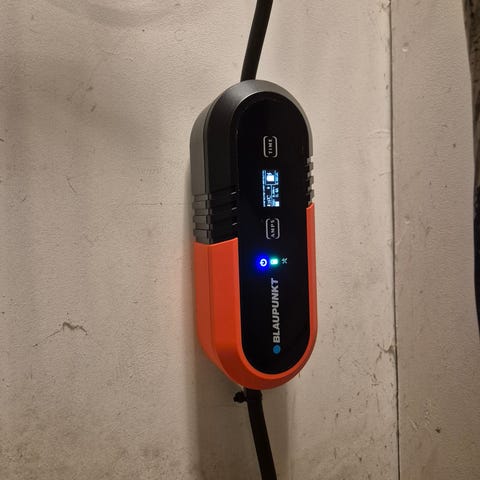 Sähköauton latauskaapeli ja seinäteline.