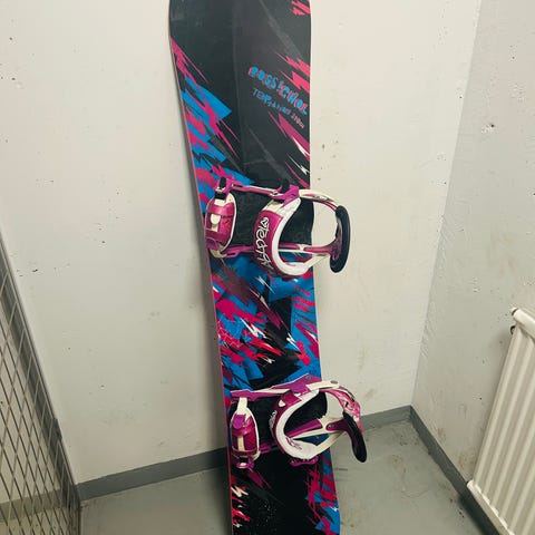 Lumilauta siteillä. Laudassa vaaleansininen yläpuoli ja pohjassa graafinen kuusikuvio vihreällä ja violetilla. Jäykkä ja kovassa käytössä ollut yleissiisti lauta! Siteiden remmit voisi uusisi, mutta ne toimii.