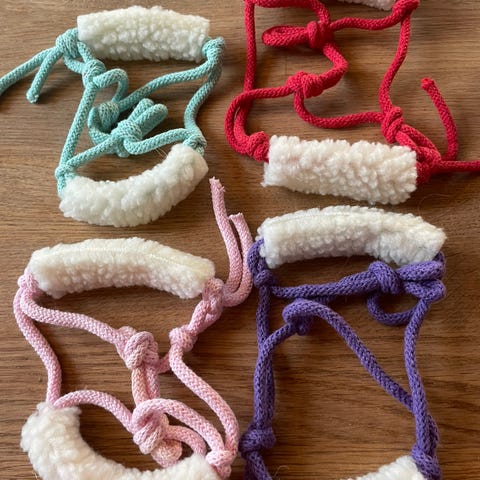 Tarvikkeita keppihevoselle. Harja ja kaviokoukku oikean hevosen, mutta ovat olleet käytössä vain keppihevosilla. Puiset päärynät olleet keppihevosien herkkuna, niille mukaan säilytyspussukka. Vaikka päärynä ei ehkä yleisin hevosen herkku ole, niin keppihevonen kelpuuttaa kyllä. 😅 Hyväkuntoisia leikeissä olleita.