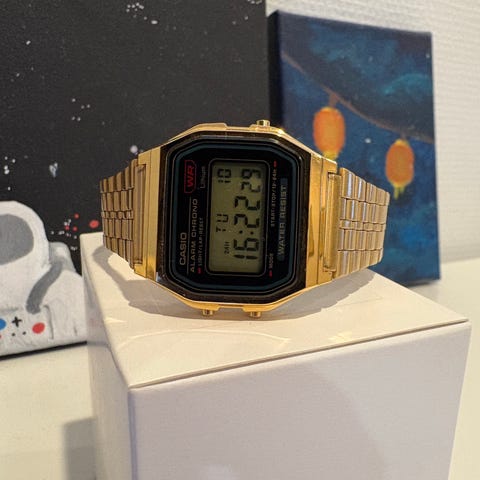 Casio digitaalinen unisex-rannekello. Kellossa on suorakaiteen muotoinen digitaalinen näyttö, jossa näkyy aika, päivämäärä ja sekunnit. Näytössä on lisäksi maailmanaika- ja karttanäkymä sekä erillinen pienempi näyttö lisätoiminnoille. Siistikuntoinen, noin puoli vuotta vanha. Lasissa vähäistä käytön jälkeä.