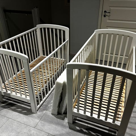 Valkoinen pintasänky pyörillä hoitopöytä sekä imetystyyny