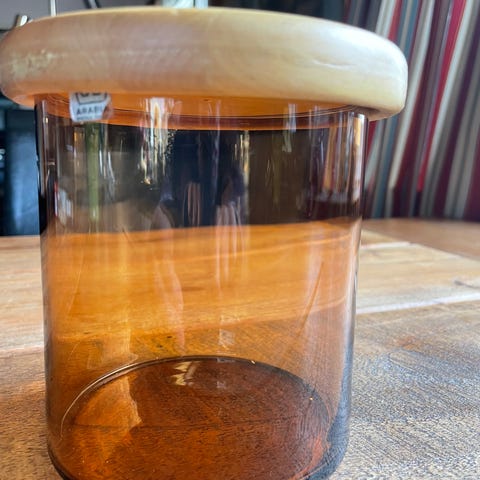 Kaj Franck Purtilo, vihreä. Kaj Franckin Nuutajärven Lasille suunnittelema Purtilo-niminen vihreä lasipurnukka puukannella, 1970-luku. Korkeus ilman kantta 8 cm, halkaisija 11 cm. Purkissa on pieni naarmu.