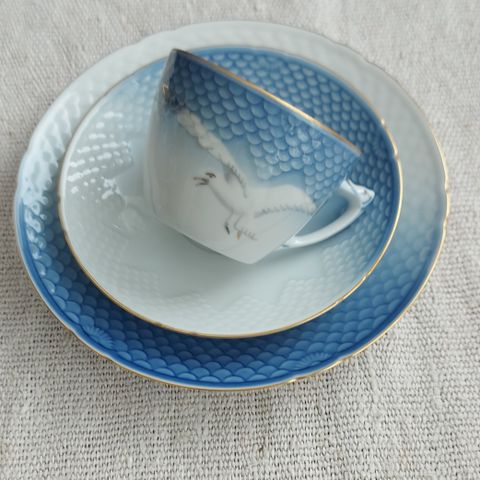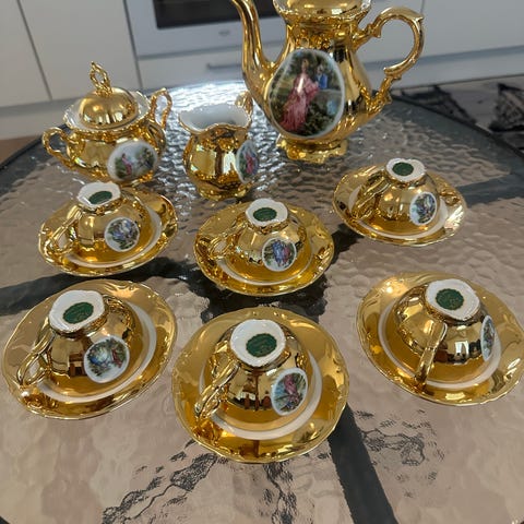 8 kpl kahvikupit, tassit ja pullalautaset. Yksi kpl iso kannu, kermakko, sokerikko ja tarjoilulautanen.