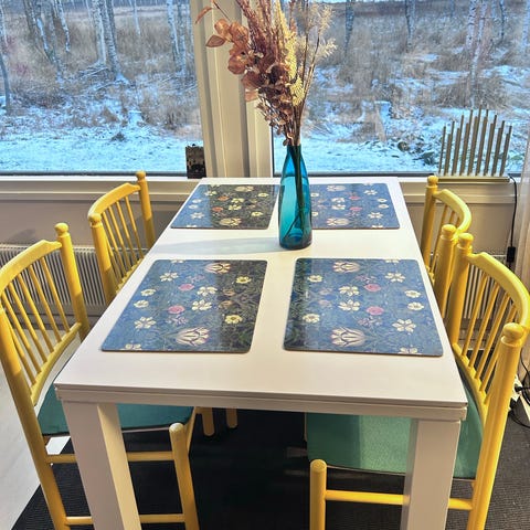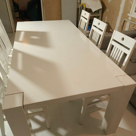 Myydään italiassa tehdyt Calligaris ruokapöytä ja neljä tuolia. Pöydässä on musta puukehys ja valkoinen laminaatti tai vastaava kulutusta kestävä taso sekä metalli jalat. Tuoleissa on nahkainen istumaosa ja muut osat puuta. Tuolien koko on 50 x 45 x 88 cm (S x L x K). Istuinosan korkeus on 46 cm. Kaikissa on nähtävissä kulumaa ja elämän jälkiä, varsinkin tuoleissa. Kahdessa tuolissa selkänoja on hieman löysällä, ja toisessa niistä on halkeamia (näkyy kuvassa). Lisäksi yhden tuolin istuinosa on löystynyt.