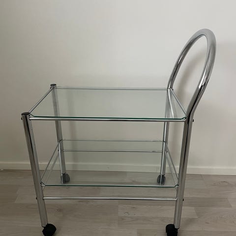 Metallirakenteinen, valkoinen, ovaalin muotoinen lasitasoilla oleva tarjoiluvaunu.
