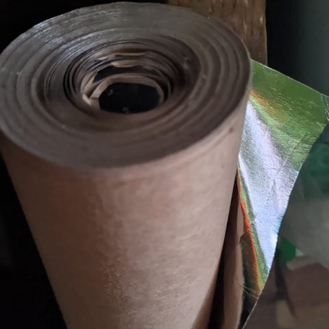 Bitumipaperi rullatavarana. Pituus noin 30 m ja leveys 1,25 m. Neliöpaino 140 g/m² ja rullan paino noin 4,2 kg. Soveltuu esimerkiksi rakennus- ja suojauskäyttöön, kuten aluskatteeksi tai tuulensuojaksi rakenteissa valmistajan ohjeiden mukaan. Neljä rullaa joista kolme avattu. Yhteensä reilut sata neliötä. Uusia. Ostettu K-Raudasta.