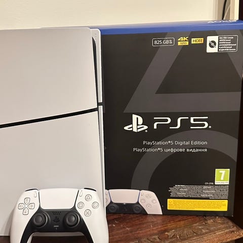 Myynnissä käyttämätön PlayStation 5 Slim Digital konsoli. Kuvissa näkyy alkuperäinen pakkaus, joka on avattu vain tarkistaakseen, että kaikki on paikoillaan. Malli CFI-2116. Pakkaus sisältää kaiken, mitä uusissa pleikkareissa tulee mukanaan.