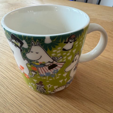 Arabia Muumi Tove 100 muki vihreällä kuvituksella. Posliininen kahva muki, jossa Muumi-hahmoja ympäristöineen mukin ympäri kulkevassa kuvituksessa. Muki sopii kuumille juomille, kuten kahville, teelle tai kaakaolle arki- ja juhlakäyttöön. Pohjassa Arabia-leima ja Tove 100 -merkintä.