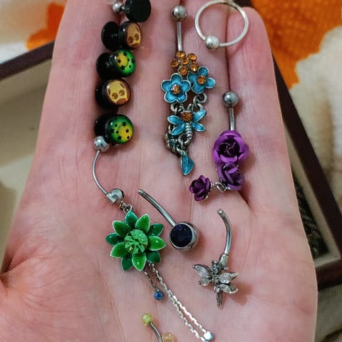 Korurasiassa lojuvia lävistyskoruja. Keskimmäinen on eniten käytetty, muut muutamia kertoja käytetty