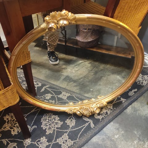 Suorakaiteen muotoinen, kullattu, osittain uurrettu ja osittain eebenpuunvärinen kaistale, reliefikoristelu rucoloilla ja akantusköynnöksillä, soikea peilileikkaus fasettihionnalla, kokonaismitat noin 60 x 70 cm.