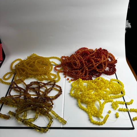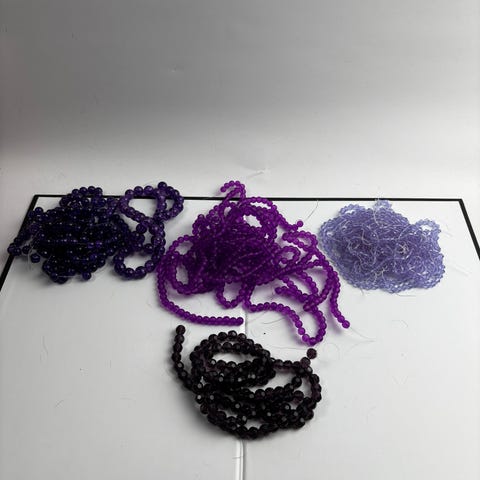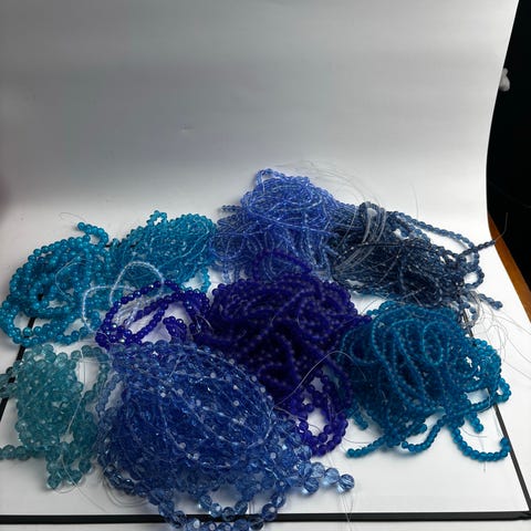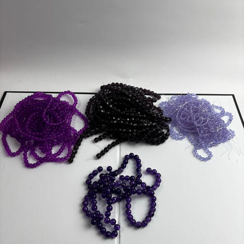 Erä erilaisia helmiketjuja mustan ja harmaan sävyissä. Mukana useita eri pituuksia ja helmen kokoja, osa kiiltäviä ja osa mattapintaisia. Sopivat esimerkiksi korujen tekoon, askarteluun tai vaatteiden ja asusteiden koristeluun. Materiaali lasia. 57kpl