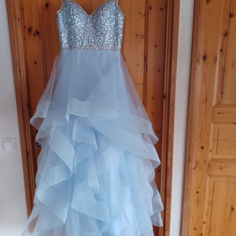 Naisten ilta- tai juhlapuku koossa XS. Mekko käy myös S kokoiselle tai jopa M. Mekossa on vihreä sävy ja useasta kerroksesta koostuva, runsas helma. Yläosa on vartalonmyötäinen, olkaimellinen ja siinä on koristeellinen etuosa. Takaosassa on nyörikiinnitys, joka mahdollistaa istuvuuden säätämisen. Sopii juhla- ja iltatilaisuuksiin.