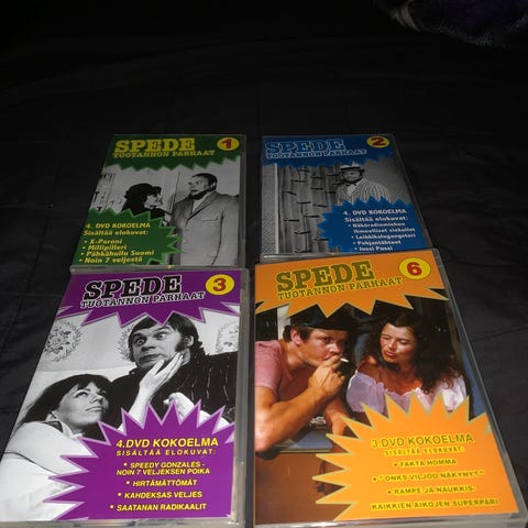 Spede Tuotannon Parhaat 2 & 5. Yhteensä 8 elokuvaa. Ei haitallisia naarmuja tai tahroja levyissä jotka haittaisivat katselua.