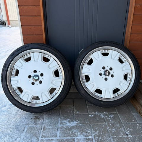Tästä juuri kunnostetut aidot 3 osaiset koottavat workit. Lipat kiillotettu ja keskiöt pulverimaalattu. Vanteet kasattu uusilla pulteilla. 5x120 20" 8,5/9,5 et 37/42. Tarkoitus oli tilata leveämmät lipat ja laittaa omaan autoon alle mutta tuli suunnitelmiin muutos niin laitetaan seuraavalle erittäin hienot vanteet. Jos on pakko jotain vaihdossa tyrkyttää niin 20" 5x120 tai 5x108 vanteita.