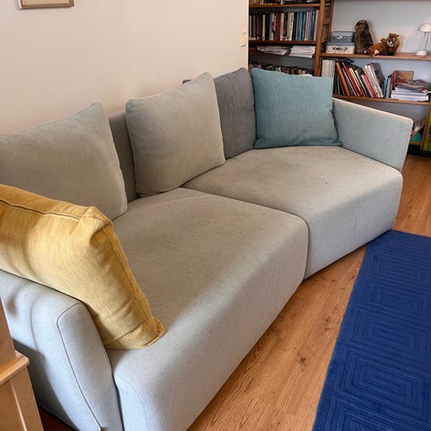 Vaalea likainen sohva, joskus kaatunu kahvit siihen