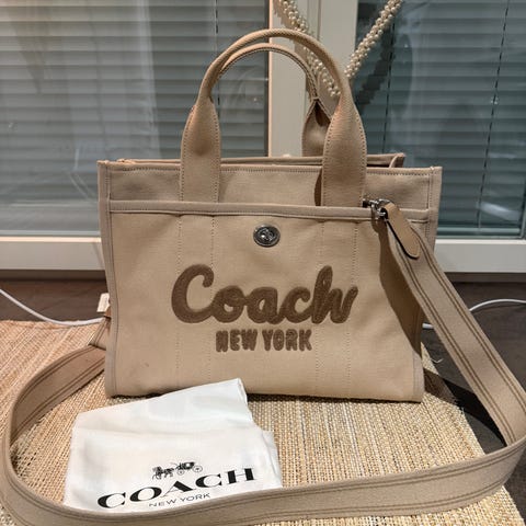 Coach kangaslaukku naisille. Beige sävyinen kangaslaukku, jossa suuret Coach New York -logotekstit edessä. Laukussa on kantokahvat sekä säädettävä ja irrotettava olkahihna. Pääosasto suljetaan vetoketjulla, sisällä on avointa tilaa arjen tavaroille. Materiaali on kestävää kangasta. Mukana tulee suojapussi kuvien mukaisesti.