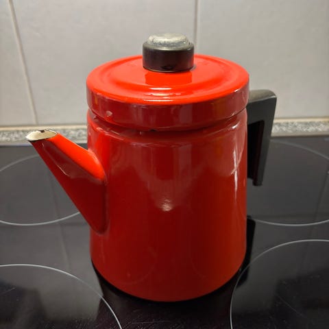 Finelin 0,6 l:n kahvipannu. Kuvassa näkyy pienet maalisäröt pohjan lähellä, mutta hyväkuntoinen kuitenkin ihan on.