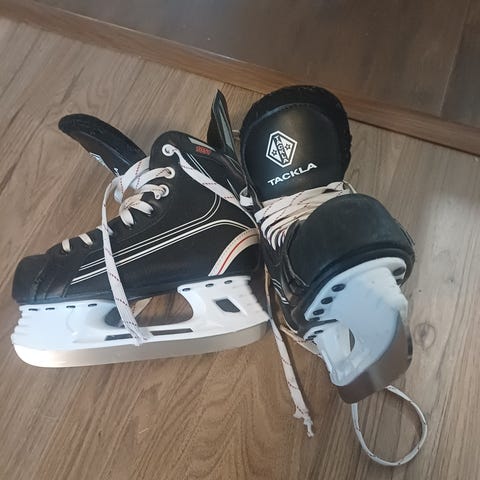 Jääkiekkoluistimet lapsille tai aikuisille, koko 38, sisämitta 24,5cm. Väri musta-valkoinen. Perinteinen nauhakiinnitys ja jääkiekkoon soveltuva terärakenne. Soveltuvat lasten jääkiekkoharjoitteluun ja yleiseen luisteluun. Käytön jälkiä. Ei ole teroitettu.