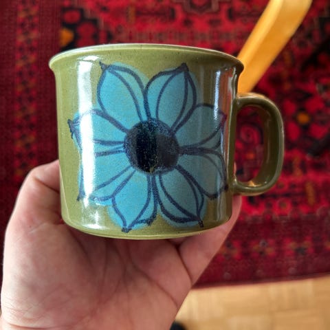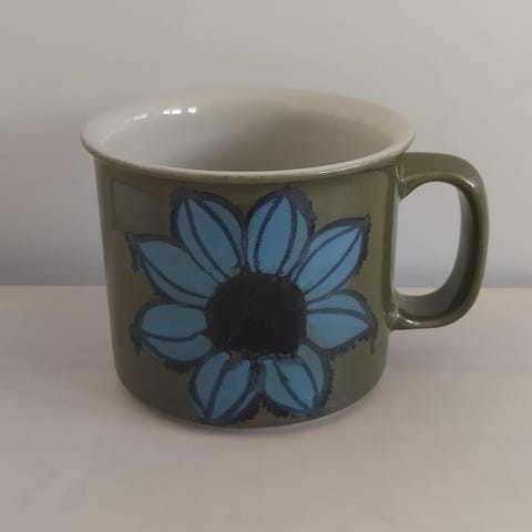 Näitä ei tule usein vastaan! Arabian käsinmaalattu Hilkka-Liisa Aholan / Ulla Procopén suunnittelema kukkakuvioinen muki 1960-luvulta. Hyvänkokoisessa 0,4 l mukissa on monivärinen kukkakoriste molemmilla puolilla. Materiaalina on lasitettu keramiikka.