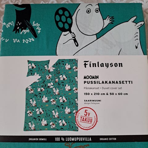 Arabia Moomin kaitaliina. Koko 40 x 140 cm. Materiaali 100 % luomupuuvillaa. Vaaleanvioletilla pohjalla on Muumi-aiheinen kuvitus eri hahmoineen ja kasviaiheineen. Sopii käytettäväksi pöydän keskellä kaitaliinana eri vuodenaikoina. Hoito-ohjeet löytyvät tuotteen pesulapusta ja pakkauksesta.